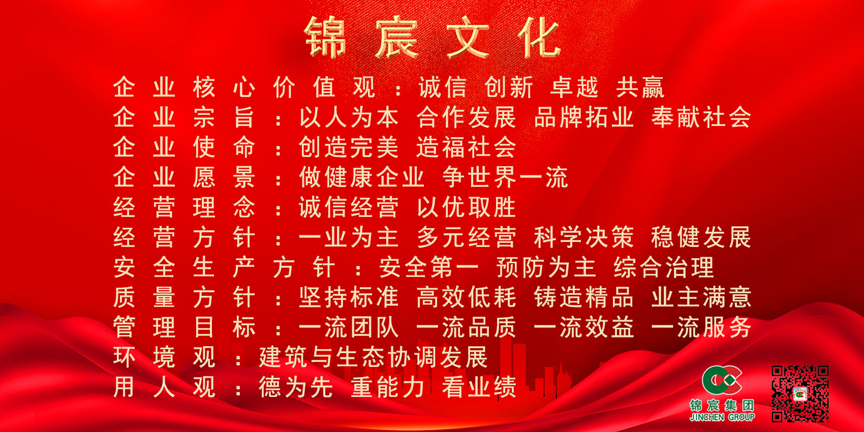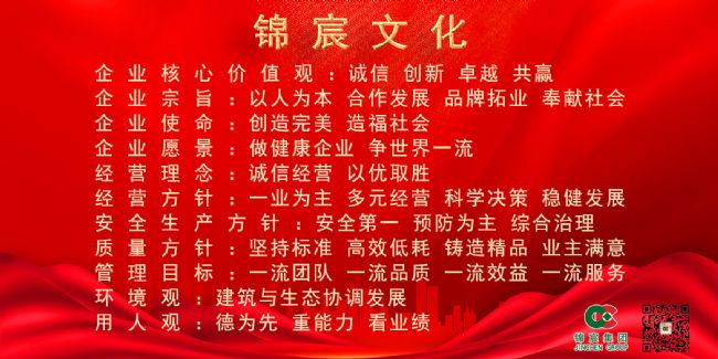 企业核心价值观:诚信 创新 卓越 共赢 企业宗旨:以人为本 合作发展 品牌拓业 奉献社会 企业使命:创造完美 造福社会 企业愿景:做健康企业 争世界一流 经营理念:诚信经营 以优取胜 经营方针:一业为主 多元经营 科学决策 稳健发展 安全生产方针:安全第一 预防为主 综合治理 质量方针:坚持标准 高效低耗 铸造精品 业主满意 管理目标:一流团队 一流品质 一流效益 一流服务 环境观:建筑与生态协调发展 用人观:德为先 重能力 看业绩