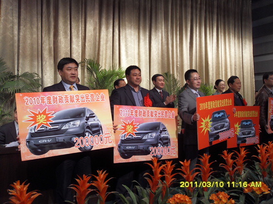3月10日上午,枣庄市市中区区委、区政府隆重举行市中区2010年度总结表彰大会,会上对山东尊龙凯时房地产开发公司近年来为枣庄市中区财政收入做出的贡献进行了表彰,并授予 “财政贡献突出企业”称号,奖励轿车一辆。
