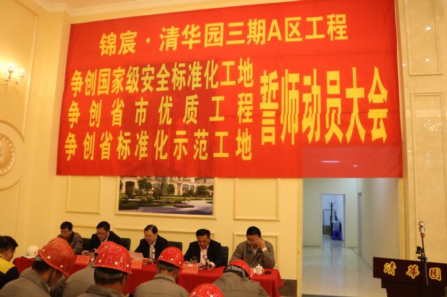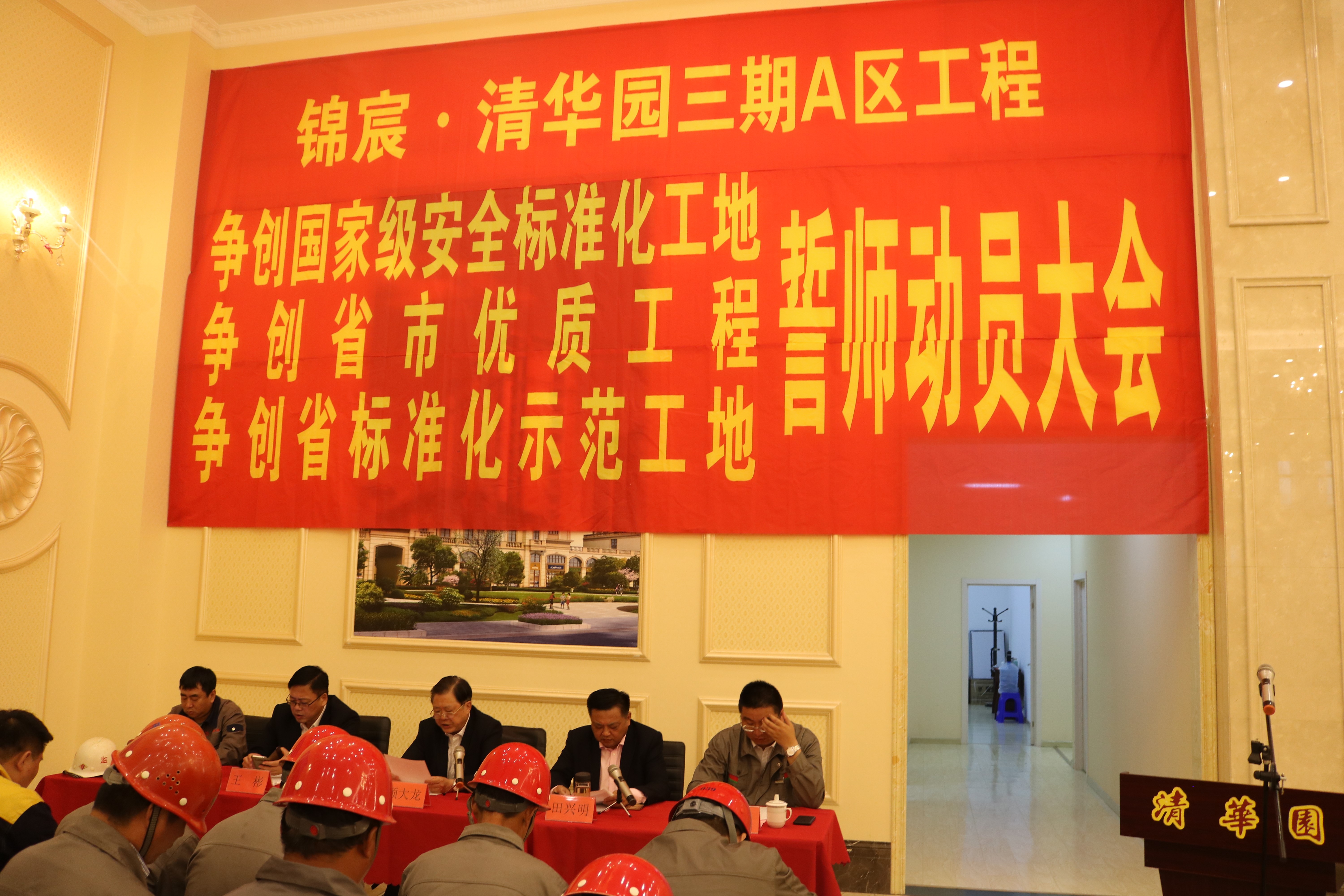 5月28日,吉林尊龙凯时房地产开发有限公司、尊龙凯时集团有限公司梅河口直属项目部在吉林省梅河口市清华园售楼中心召开了清华园三期工程A标争创吉林省“长白山”杯优质工程暨争创国家“三A”级工地、吉林省房屋建筑工程标准化工地誓师动员大会,项目部、监理部、物业部、开发公司全体管理人员、各劳务班组负责人、材料供应商、房屋销售人员等120多人出席了会议;会议由开发公司常务副总田兴明同志主持,集团公司领导颜大龙同志作了题为《精益求精再铸省优工程 一心同功争创标化示范工地》的动员报告;项目经理吴伟等11名同志作了表态发言。会议要求全体管理人员、劳务负责人充分认识争创吉林省“长白山”杯优质工程的重要性,争创国家“3A”级工地、省标准化工地的必要性,进一步狠抓当前生产、抢抓销售机遇的紧迫性。确保二期工程2018年9月10日前交房、三期A标段8月份全面封顶、三期B标段9月份破土动工。确保清华园质量口碑、现场口碑继续名列梅河前茅!确保社会效益、企业经济效益双丰收!