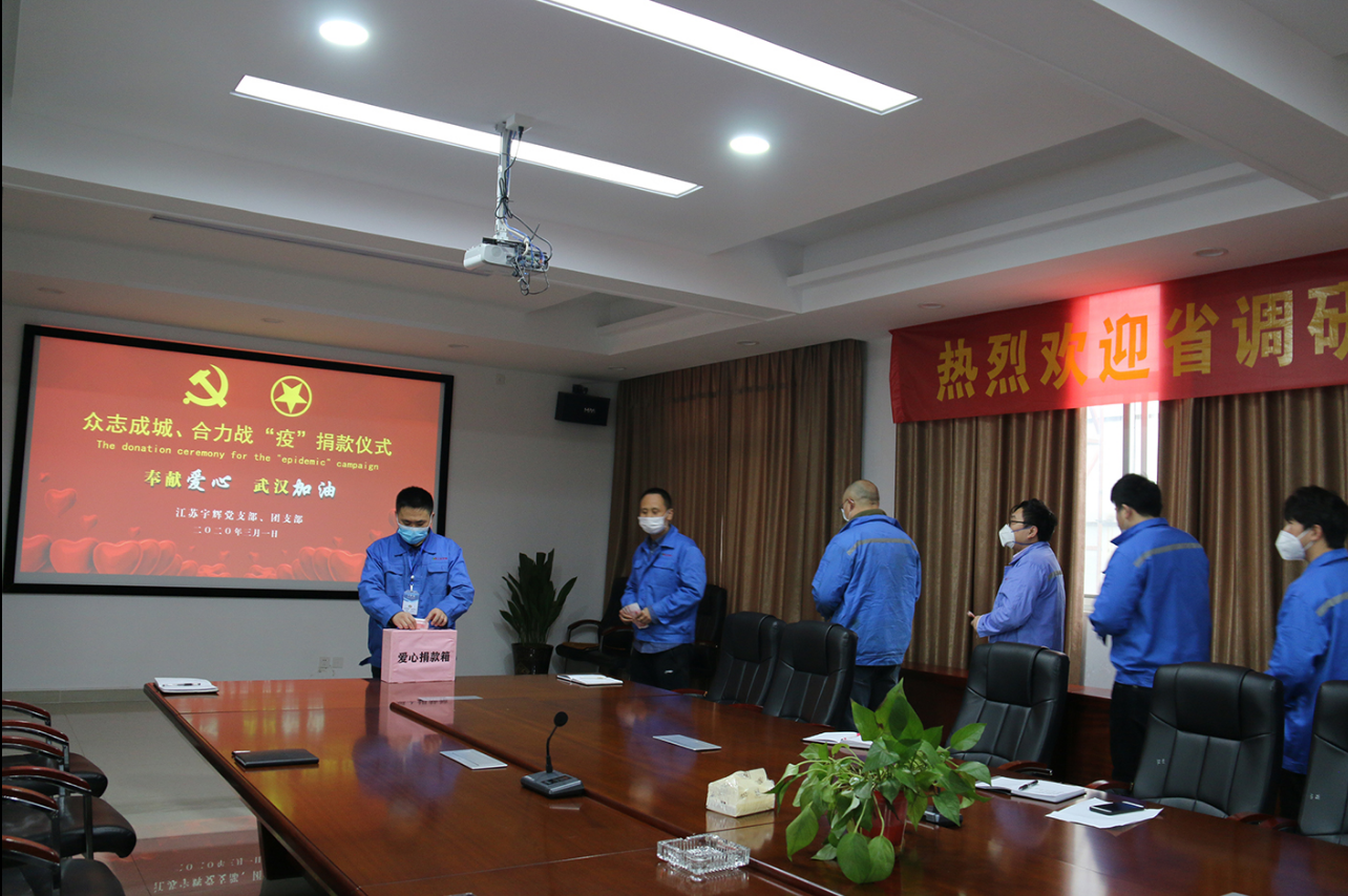 活动中,江苏宇辉支部党员、团员重温入党、入团誓词,强化责任担当,大家结合自身实际就如何在疫情防控中发挥党员、团员先锋模范作用作了表态发言,并进行了抗疫爱心捐款活动。