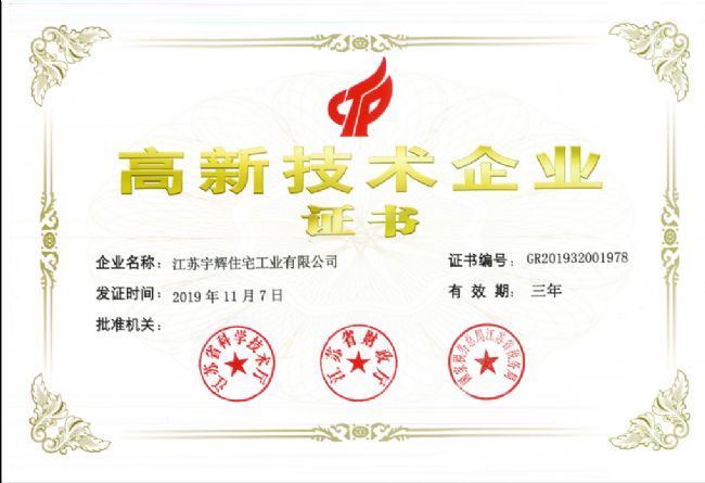 近日,江苏宇辉住宅工业有限公司顺利通过全国高新技术企业认定管理工作小组认定,成为国家高新技术企业。