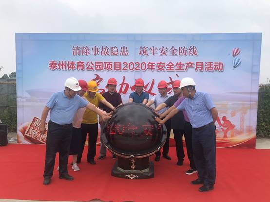 “消除事故隐患,筑牢安全防线”,6月11日上午,泰州体育公园项目举行2020年“安全生产月”活动启动仪式。市体育局副局长李铁军,市城投公司副总程小平,市安监站站长仲飞,市城投公司安全部部长袁德忠,中体泰州项目公司董事长李焕军和项目相关负责人参加活动。
