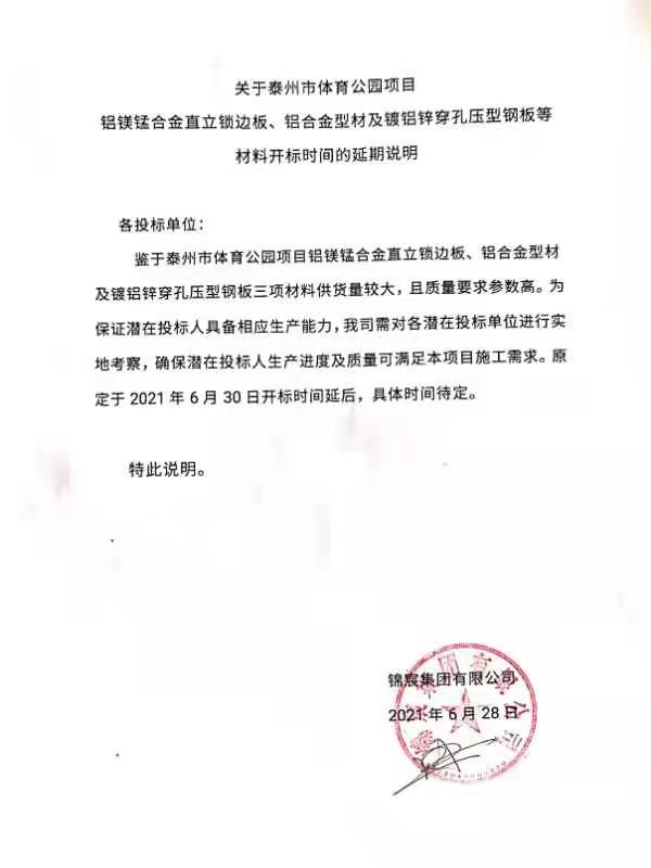 泰州市体育公园项目-铝镁锰合金直立锁边板、铝合金型材及镀铝锌穿孔压型钢板等延期开标说明