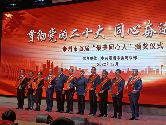 12月14日,泰州市委统战部为泰州市首届19名“最美同心人”颁奖,经过前期人选推荐、初评筛选、复评终审、网上公示最终评选出的19人为参政建言、创业创新、敬业奉献、唯实唯勤四个类别。