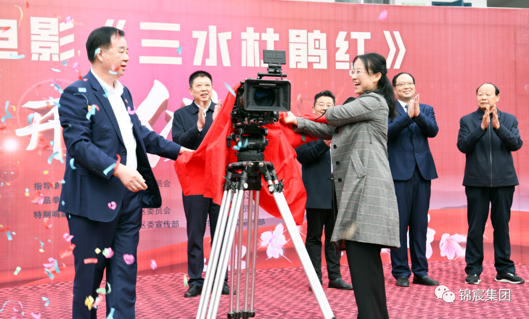 韶山市委常委、宣传部部长何浪主持开机仪式,韶山市副市长彭乐和集团公司董事长李焕军共同为网络电影《三水杜鹃红》开机仪式揭幕,泰州广播电视台领导介绍网络电影的筹备情况、拍摄计划和宣传计划等,《三水杜鹃红》电影主演、李焕军董事长的扮演者作表态发言。