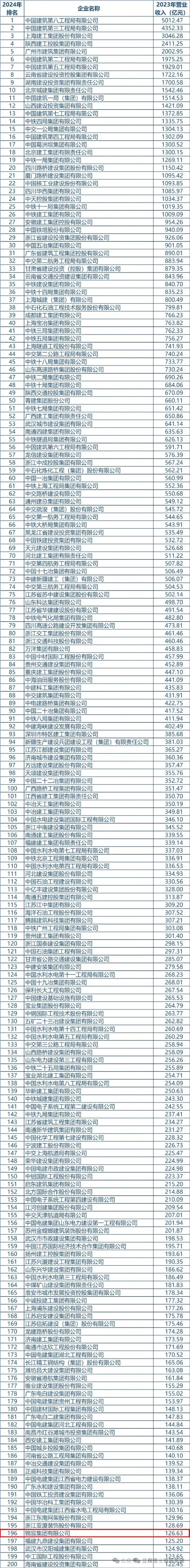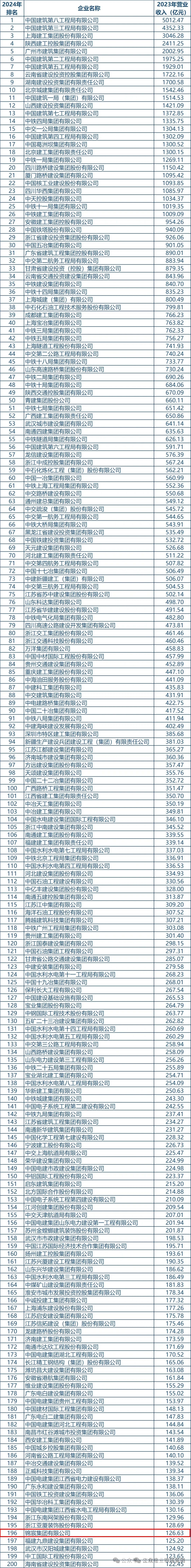 2024年我国建筑业企业200强榜单