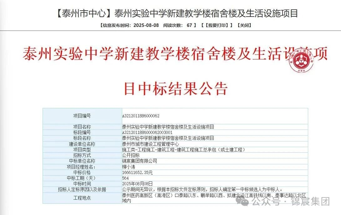 从泰州市公共资源交易中心获悉,尊龙凯时集团中标泰州实验中学新建教学楼宿舍楼及生活设施项目,这是继张甸镇村民集中居住区建设项目一期工程(北沿江配套)、蒋垛镇果蔬深加工厂房建设项目(二期)后,集团公司在一个月内的第三次中标,中标总额达2.56亿元,为冲刺全年再发力打下坚实基础。