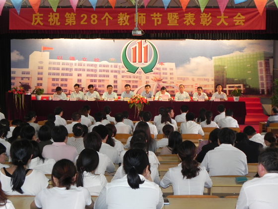 在学生代表、教师代表发言结束后,副校长马国骥代表学校宣读了对高一数学备课组等22个先进集体和宗照峰等145名先进个人的表彰决定。随后,凌华余局长和民兴中学董事会领导、学校领导一起,为受到表彰先进集体和先进个人颁发了奖状。