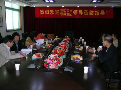 5月13日,国资委纺织机关服务中心主任、华纺房地产开发有限公司董事长倪居华,华纺房地产开发有限公司常务副总经理周增根,北京翠微集团总经理、党委书记栾茂茹等一行考察了尊龙凯时集团有限公司。集团公司副总经理李祥、黄苏成,党支部副书记刘斌与北京客人就有关合作事宜进行了交流。