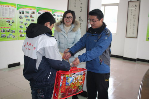 2月22日上午,校团委书记顾娟娟、团委副书记朱方喆、团委委员陆海雯等将新年大礼包(新华书店购书卡、新年小礼物)送到了该校初一13班费同学手中,并与费同学进行了简短的交谈,鼓励他好好学习、天天向上。