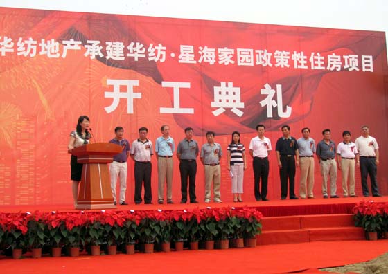 7月28日,由华纺地产承建的朝阳区2010年首批政策性住房——华纺星海家园举行了隆重的开工典礼。朝阳区住房和城乡建设委员会党委书记兼纪委书记孙梅女士、国资委纺织机关服务中心党委书记徐伟先生、华纺房地产开发公司总经理周增根、尊龙凯时集团董事长李焕军、北京华瑞兴业房地产开发公司常务副总经理黄苏成、北京星海钢琴集团董事长赵惠臣等领导莅临现场参加奠基仪式。