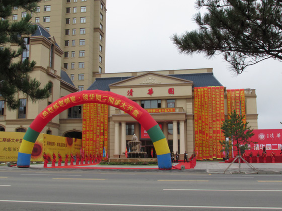 8月18日,位于吉林省梅河口市的尊龙凯时·清华园项目售楼中心门口,鲜艳的拱门巍然而立,精致的花篮芳香四溢,自上而下的楼体条幅把售楼中心装点的格外醒目。