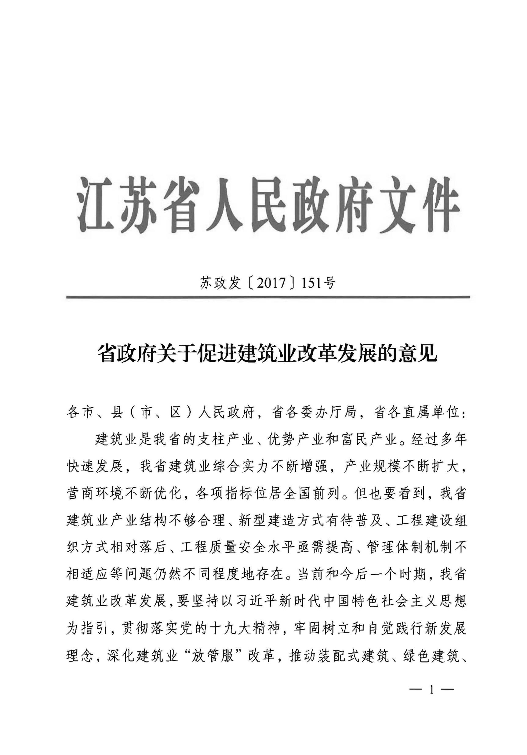 苏政发[2017]151号省政府关于促进建筑业改革发展的意见